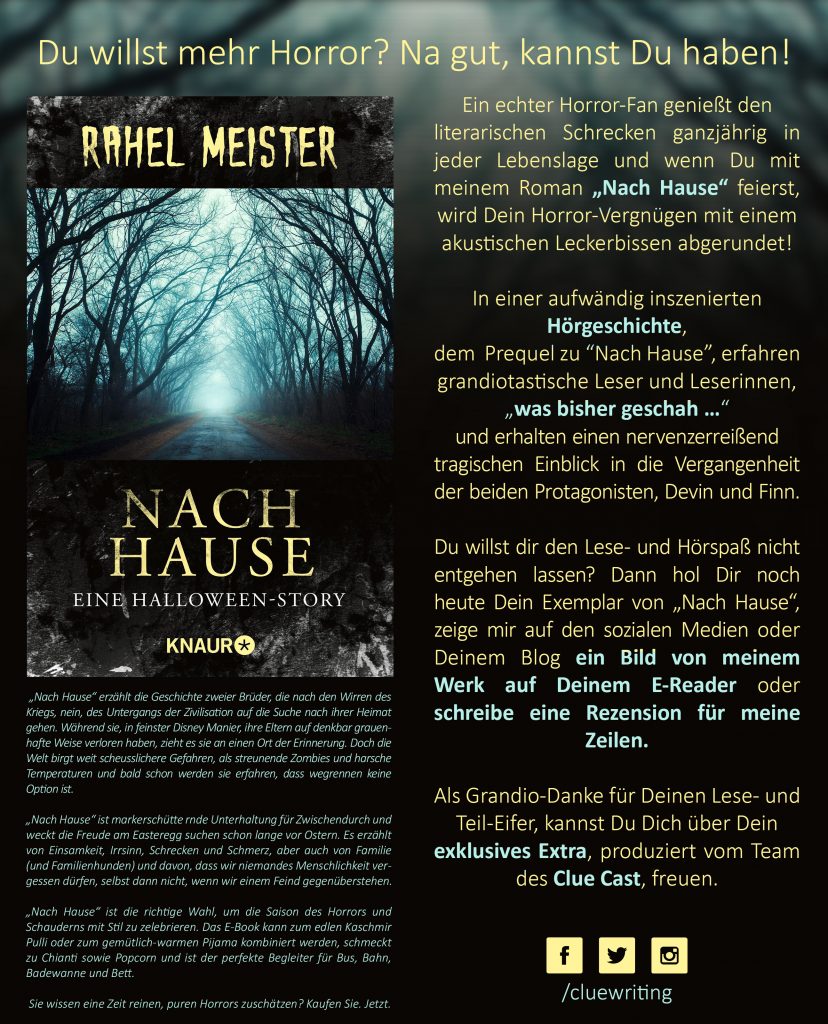 Rahels Horrorfreunde dürfen sich über ein akustisches Dankeschön von ihr freuen, denn wer sich ihr Werk auf den Reader holt, kann sich das Prequel zum Roman „Was bisher geschah …“ als aufwändig inszenierte Autorenlesung gratis bei ihr abholen. Mehr aus demselben Universum, zum Lesen und Hören, findet ihr übrigens hier.