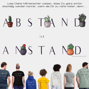 Für alle, die ihre Vernunft gerne zeigen und unhöflichen Mitmenschen die Stacheln zeigen will, hat Rahel einen Kaktusgarten fürs T-Shirt gezaubert, der euer Umfeld wissen lässt, dass Abstand Anstand ist.