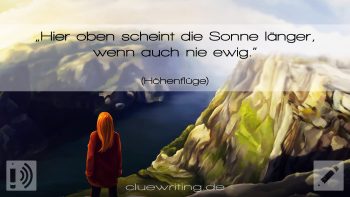 Sie war durch üppige von Vogelgezwitscher erfüllte Wälder gegangen, hatten den kühlen Schatten genossen, die Feuchtigkeit auf ihrer Haut gleichmütig als Zeichen der wohligen Erschöpfung hingenommen, bis das Nadeldach sich lichtete. Ihr Weg hatte sie den Windungen eines Flusses entlanggeführt, immer höher, dem unerreichbaren Himmel entgegen, hinweg über die sich stetig verändernde Berglandschaft. Sie schritt über knirschenden Kies, Felsen, Geröll und die Baumgrenze war unbemerkt an